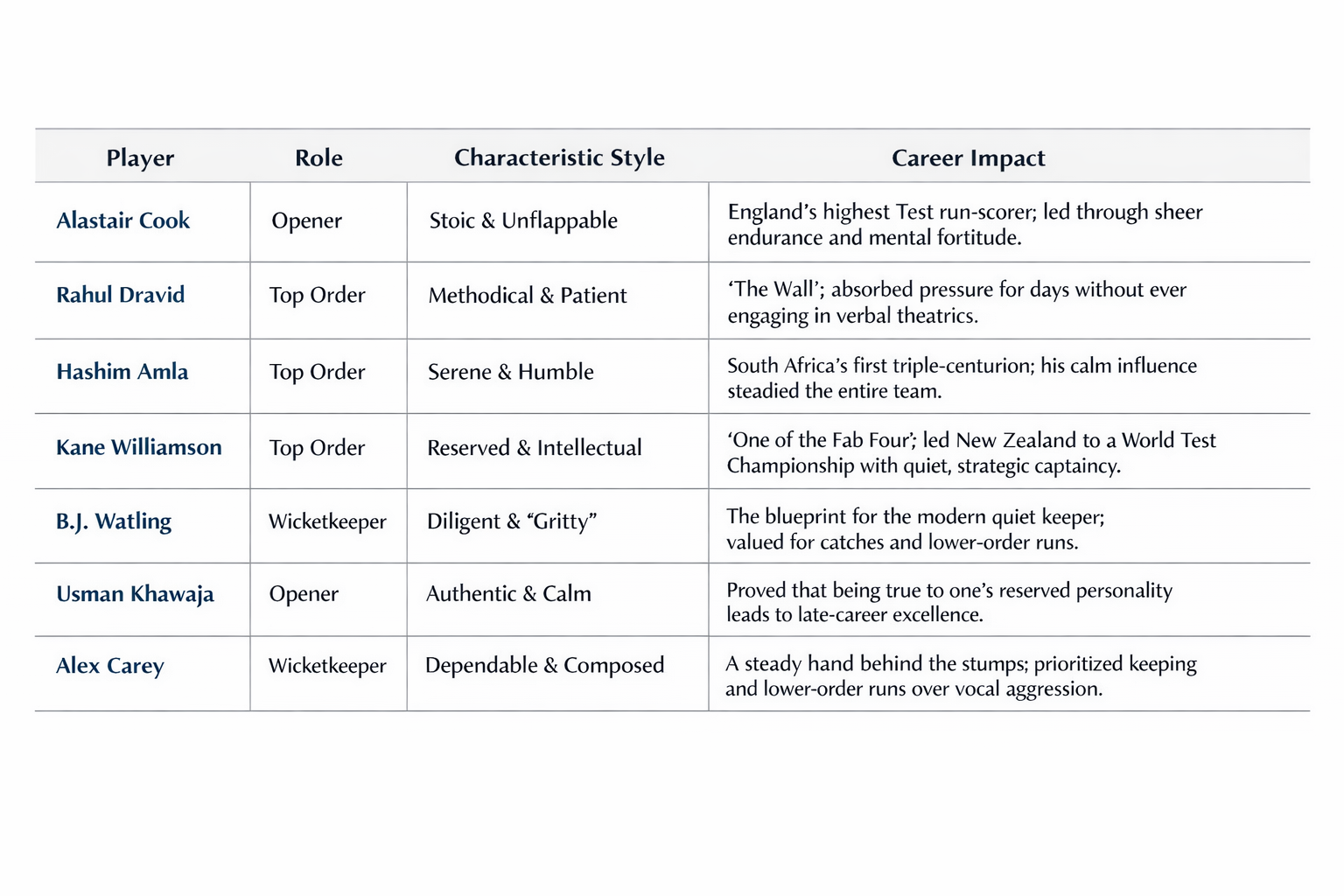 Even among wicketkeepers, BJ Watling and Alex Carey were never defined by noise but by competence. The list goes on.